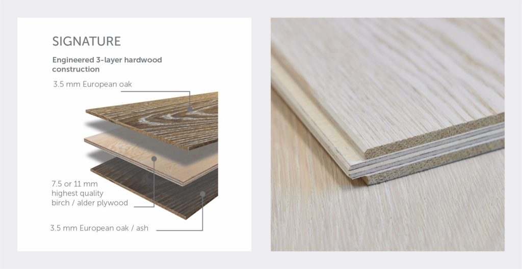 Signature is our flagship flooring construction, designed for projects where performance is non-negotiable. Built with a triple-layer structure that includes two layers of hardwood and a robust plywood core, Signature offers top-tier strength and enhanced thermal conductivity. This makes it an exceptional choice for integration with underfloor heating systems, delivering both efficiency and long-term stability.