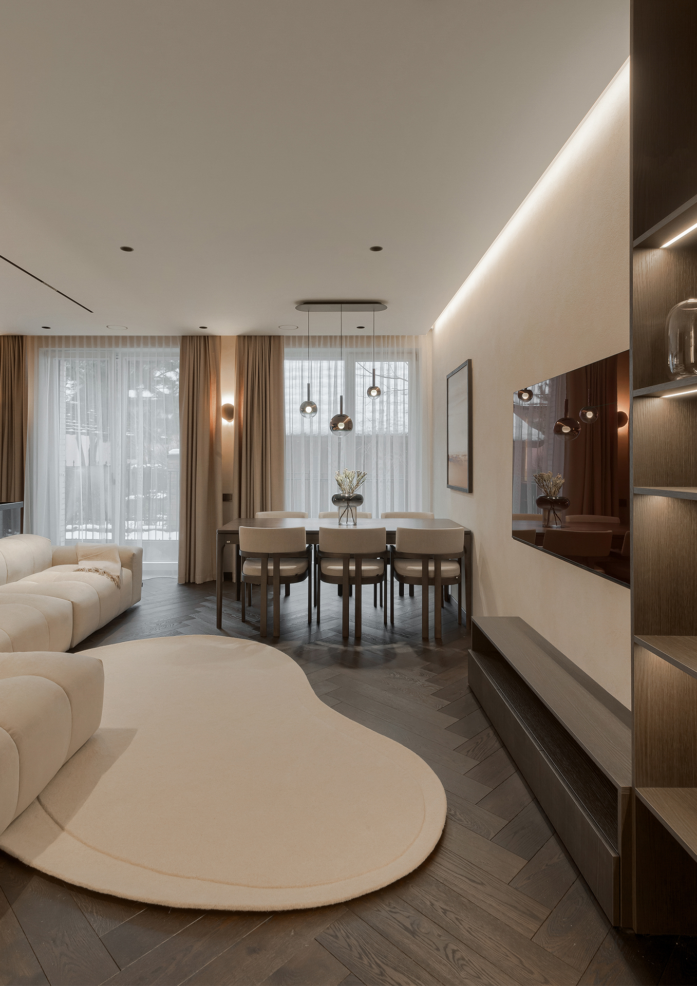 In this interior, the flooring and stairs are not merely a background element but an architectural solution that defines the entire space. Oak flooring laid in a Herringbone 90° pattern brings structure and direction to the interior, while the stairs naturally extend the rhythm of the floor, visually connecting different levels of the home into a cohesive whole.