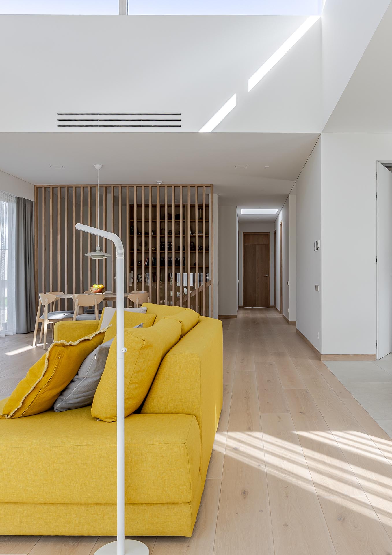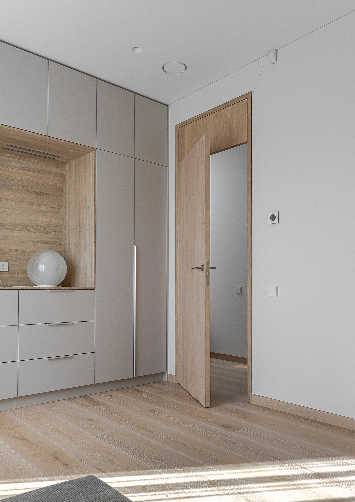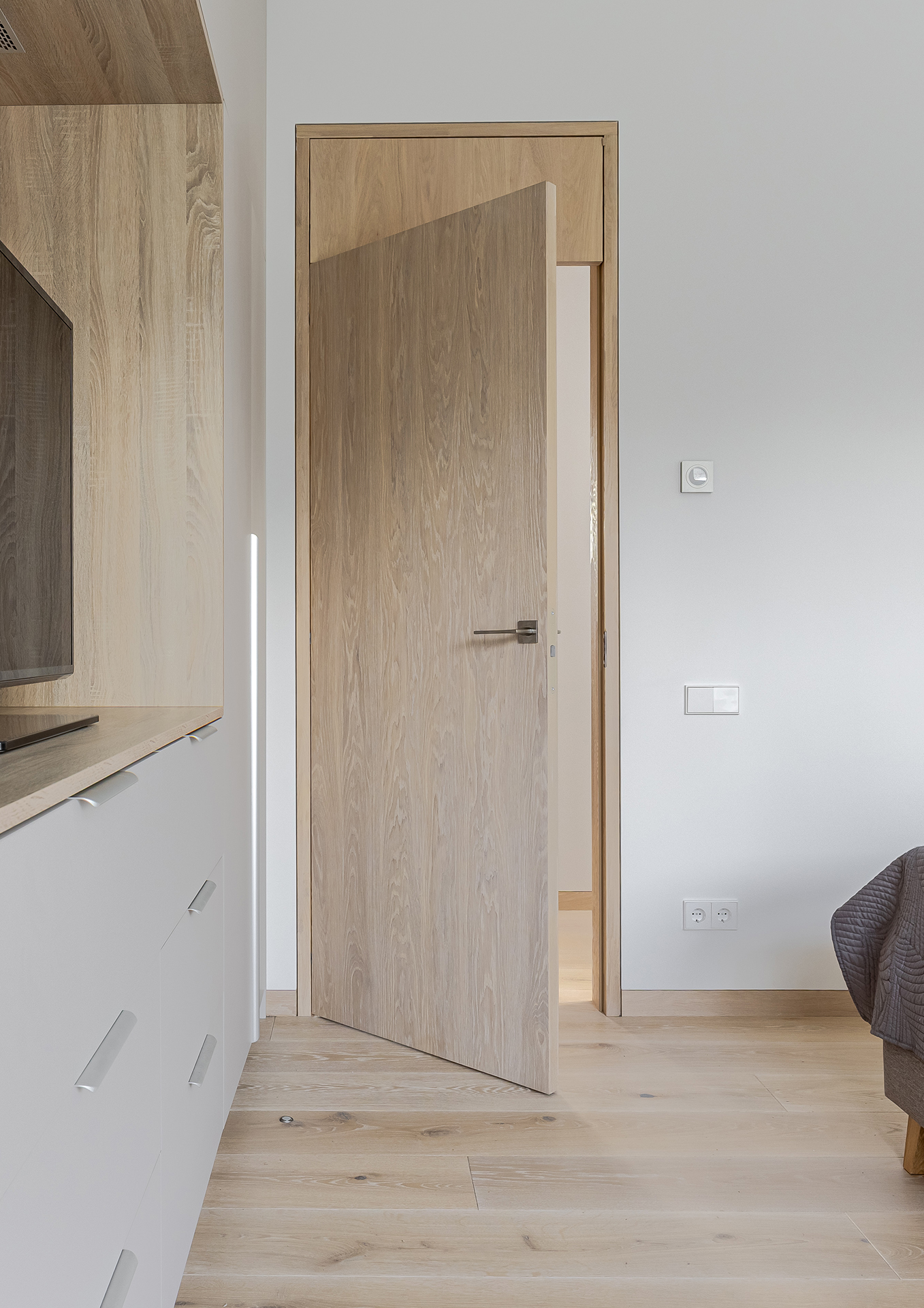 The chosen Ivory (E-2410) finish – light, subtle, and true to the natural essence of oak – brings a sense of purity and spaciousness to the interior. It enhances the play of light, creating a calm and balanced background for the entire design.