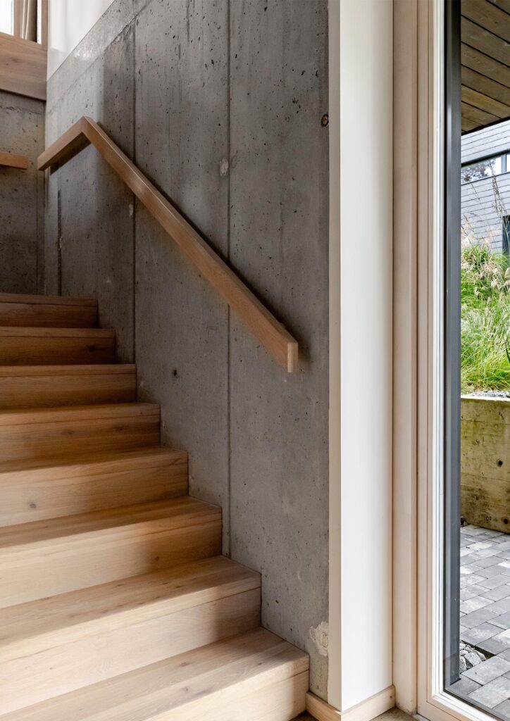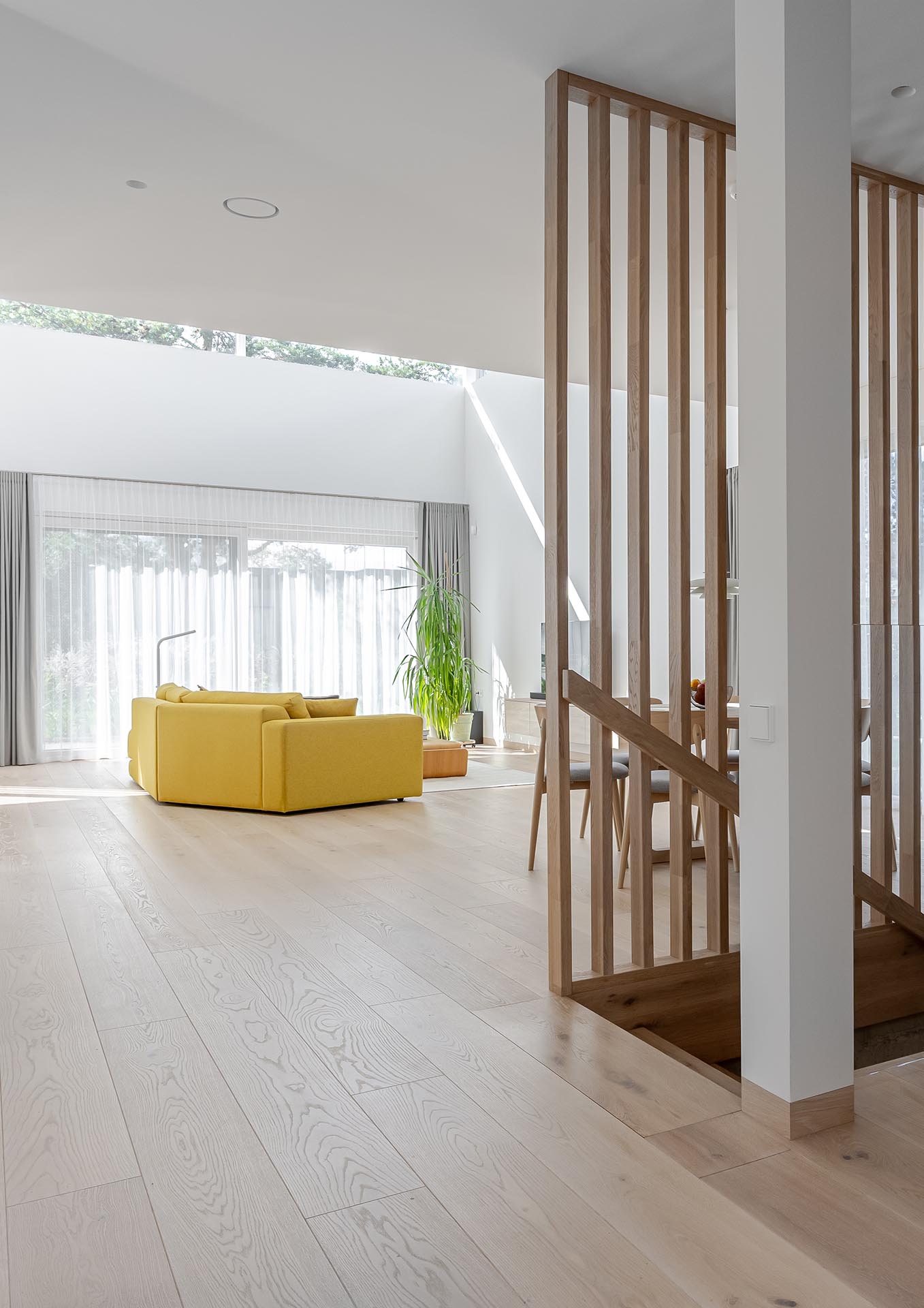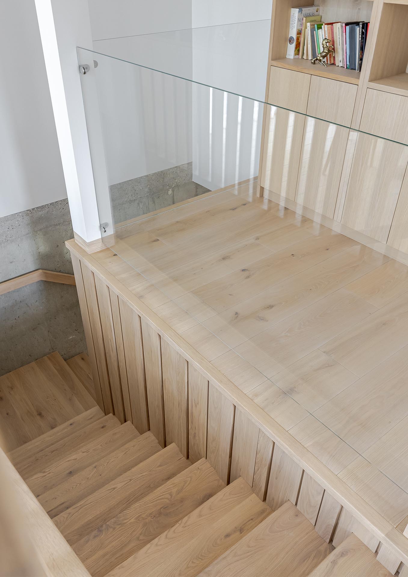 Flooring laid in a running pattern adds a natural sense of flow and movement, while stairs and skirting made from the same wood ensure perfect continuity and visual balance. The decorative oak partition acts as a refined accent, dividing spaces while maintaining the material’s rhythm and organic texture.