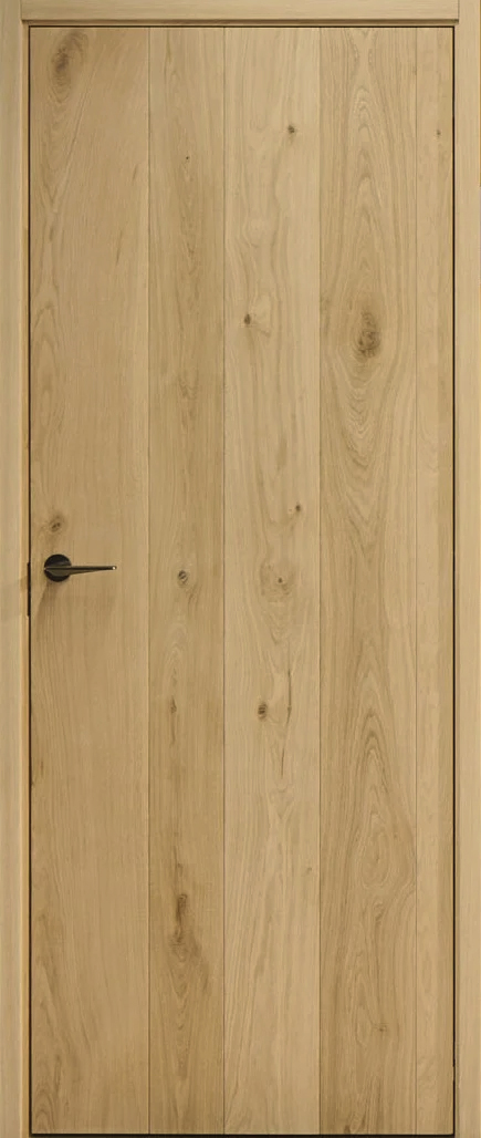 These Flemish style interior doors feature a design that harmoniously blends tradition with modernity, with a key highlight being the oak planks. The vertical arrangement of differently sized planks creates a dynamic, rhythmic pattern that visually enhances the height of the space and adds depth and character to the door surface.